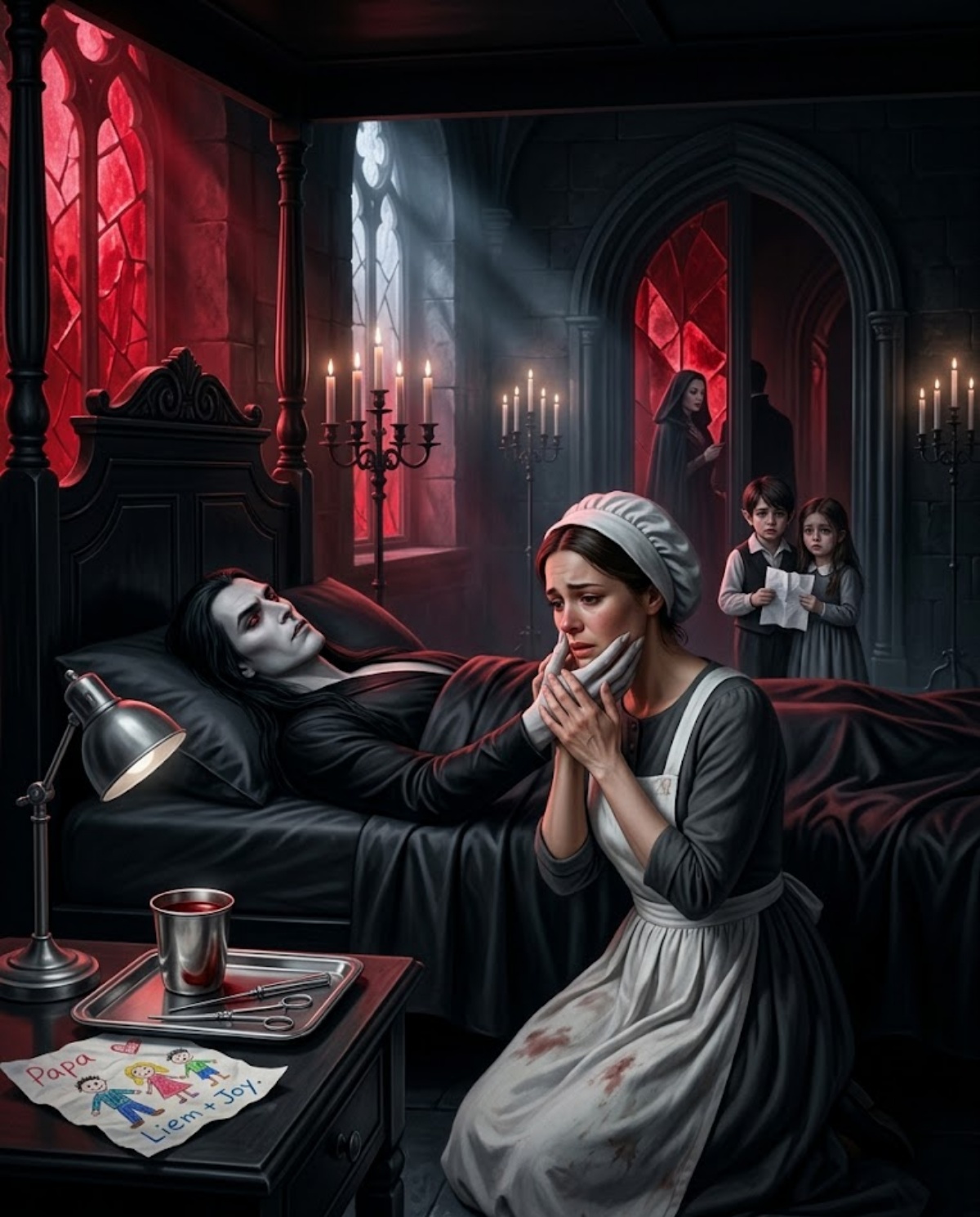 Las cortinas de terciopelo se cerraron. La habitación quedó envuelta en penumbra. Un reloj antiguo siguió marcando horas que no le pertenecían a nadie. Castiel permaneció inmóvil sobre la cama, con la piel fría como mármol, el pecho apenas moviéndose gracias a una ilusión tenue de respiración.