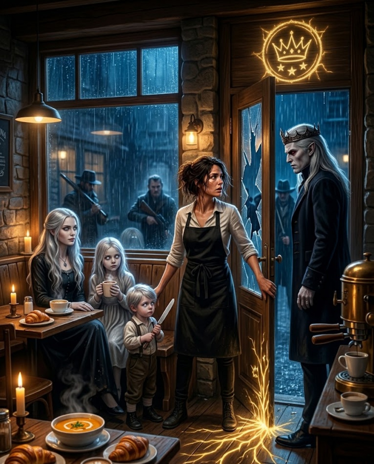 La tercera noche, un cazador cruzó la puerta, los niños temblaron, y Elena entendió que su pequeño café ya no era un negocio… era la última frontera entre la bondad humana y una guerra inmortal.