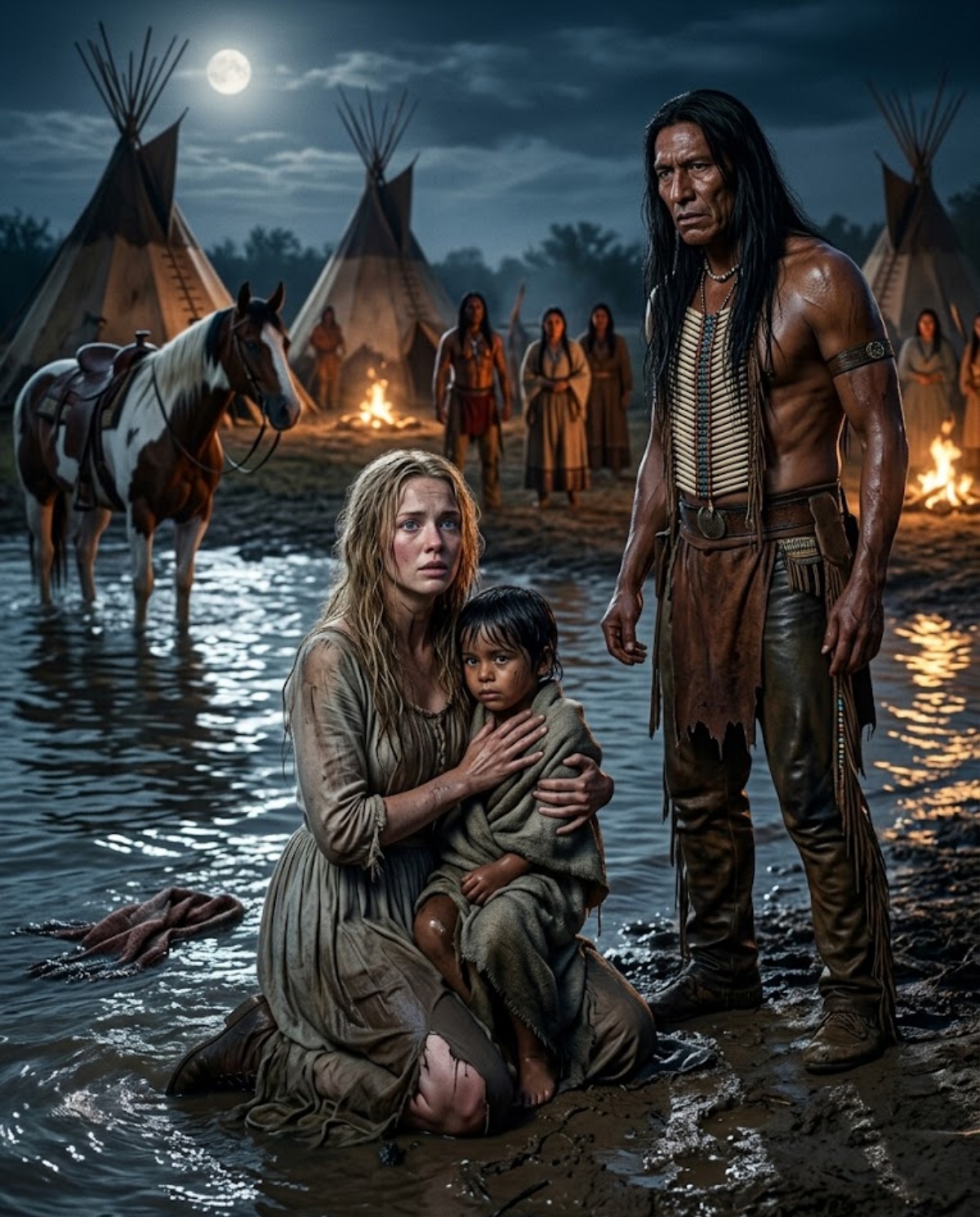 Su cabello rubio y sus ojos azules la convertían en una rareza entre la tribu. Las mujeres la miraban con cautela. Algunos guerreros con desprecio. Los niños con curiosidad descarada. Al principio la trataron como carga, como botín incómodo, como algo que no pertenecía a ningún lugar. Pero durante el viaje al campamento, un guerrero cayó de su caballo y se abrió el muslo con una roca. La herida sangraba de forma peligrosa. Sara, hija de un médico, actuó por instinto.