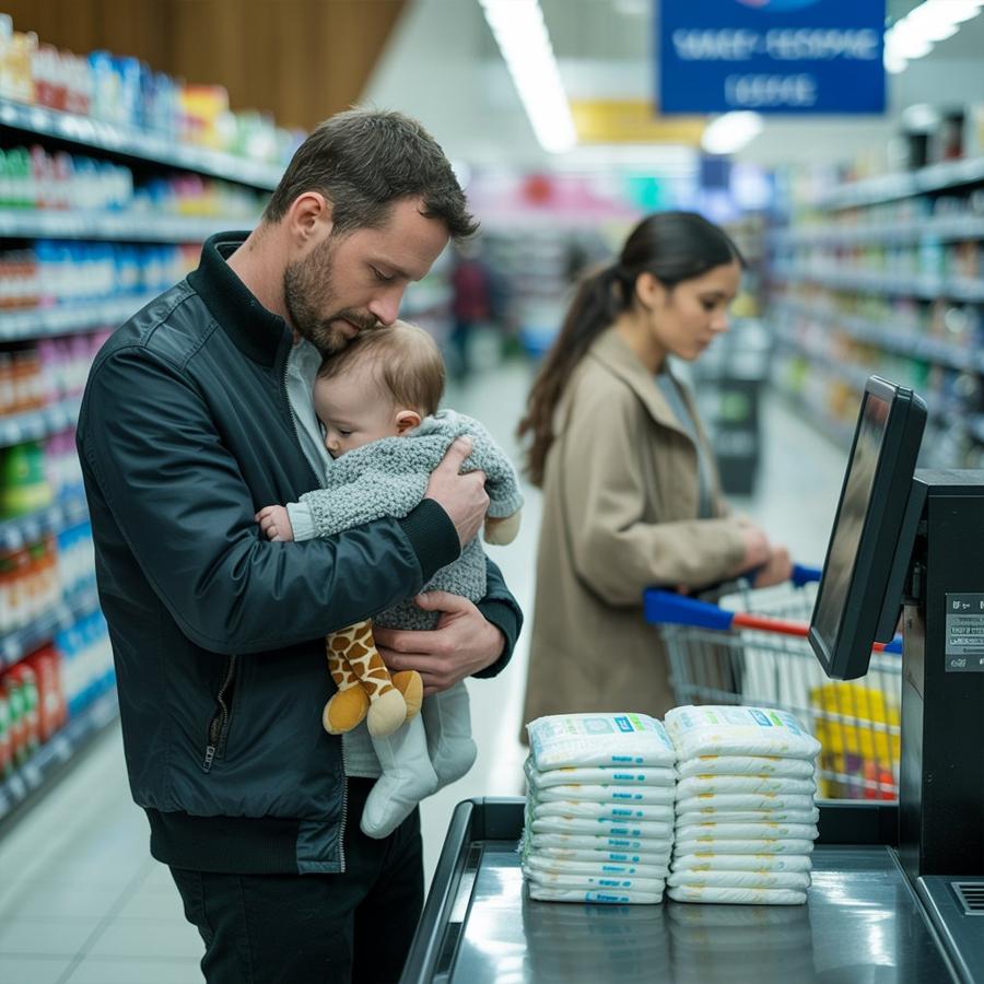 Al llegar a la caja, colocó un paquete de pañales en la cinta transportadora, preparándose para pagar. La cajera, una joven con una sonrisa amable, lo miró con simpatía al ver a Sofía llorar.