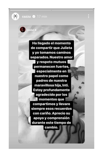 “Ha llegado el momento de compartir que Julieta y yo tomamos caminos separados. Nuestro amor y respeto mutuos permanecen fuertes, especialmente en nuestro papel como padres de nuestra hija, Inti. Estoy profundamente agradecido por los momentos que compartimos y llevaré siempre esos recuerdos con cariño”, explicó.