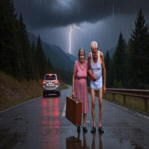 Teresa Montero llevaba 62 años en este mundo y nunca imaginó que su vida tomaría este giro devastador. Ahí estaba ella, de pie en medio de aquella carretera perdida, temblando de frío bajo su camisón de flores rosadas que se pegaba a su cuerpo por la lluvia torrencial. Sus pies descalzos se hundían en los charcos helados del pavimento mientras intentaba procesar lo que acababa de suceder. A su lado, su esposo Ricardo, de 65 años, trataba de mantener algo de dignidad, vestido únicamente con una camiseta de tirantes blanca y sus calzoncillos.