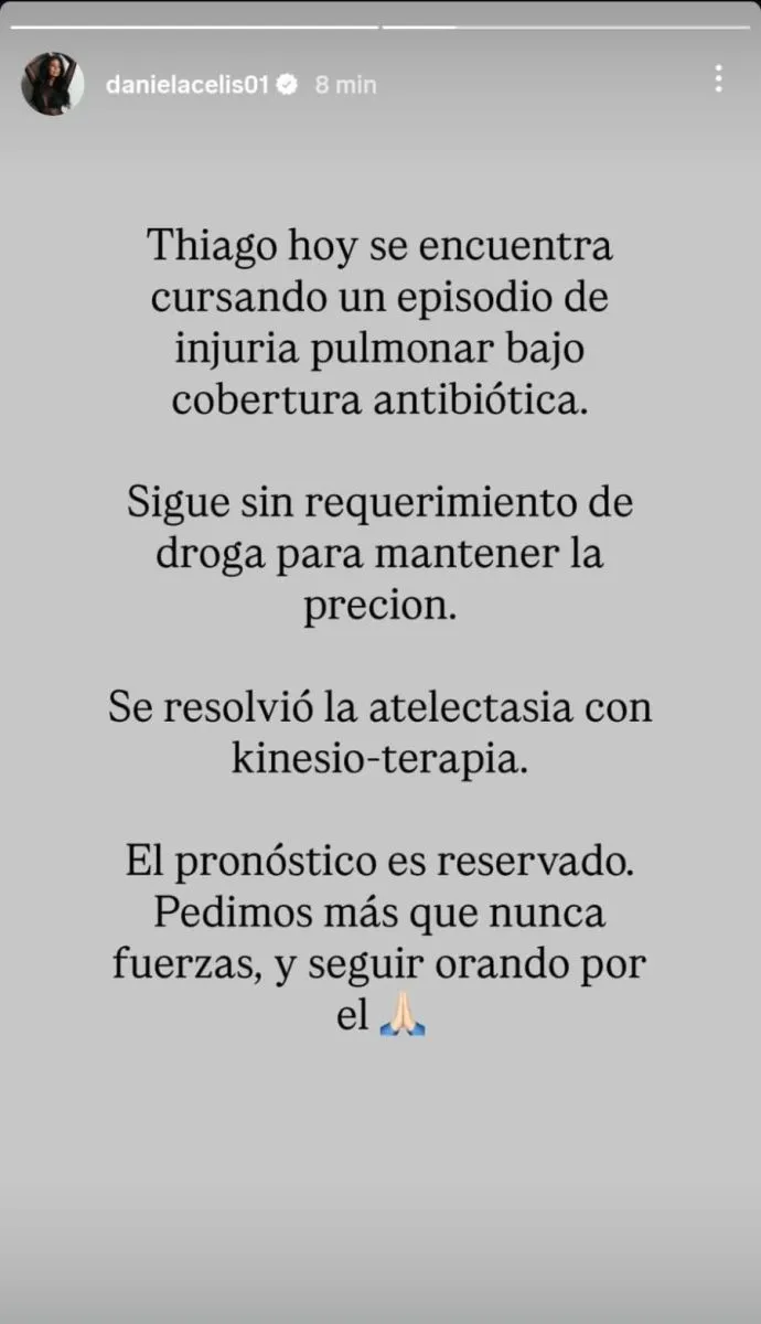 En las últimas horas, el cuadro se complicó debido a la aparición de atelectasia, una condición que afecta la correcta expansión de los pulmones. Daniela Celis se pronunció al respecto y pidió apoyo a los seguidores, reconociendo la gravedad del momento y solicitando oraciones por la pronta recuperación de Thiago. Informa Voces Críticas.