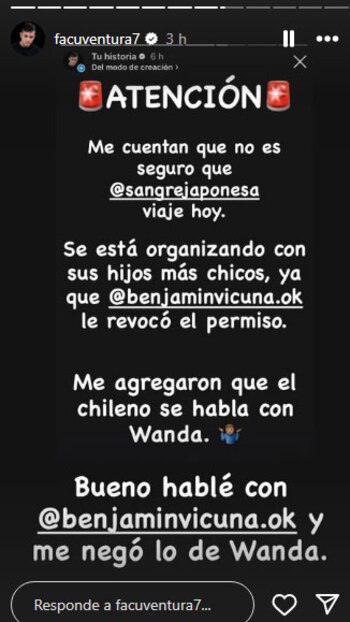 Además, la periodista aseguró que Vicuña habría conversado durante la semana con su círculo íntimo, y deslizó que “también habría hablado en la semana con Wanda Nara”. Esta última versión fue desmentida por el propio Vicuña, según relató Facundo Ventura. El periodista contó: “hablé con Benjamín Vicuña y él me negó haber hablado con Wanda Nara”.