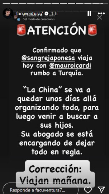 Pese a esta desmentida, el trasfondo familiar no cambió. Iavícoli resumió la situación diciendo: “La noticia de último momento es que la China acompaña a Mauro Icardi sin los hijos, viaja igual a pesar de esto que les acabo de contar”.