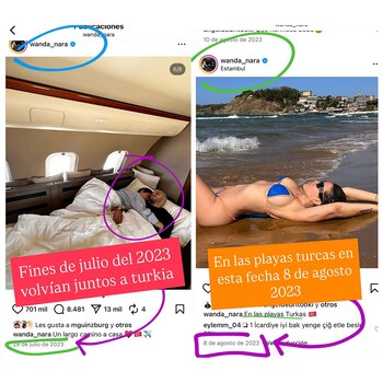 El último giro en la historia llegó de la mano de la periodista Vicky Braier, conocida en redes como Juariu. Desde su cuenta de Instagram, compartió una serie de pruebas digitales donde se observa a los involucrados en situaciones que aportan aún más tensión al relato. En julio de 2023 todo parecía estar en un punto de calma: Wanda y Mauro volvían juntos a Turquía, como ilustró una foto de ambos descansando abrazados a bordo de un jet privado, acompañada del mensaje “un largo camino a casa”. Días más tarde, el 8 de agosto, Nara se mostraba disfrutando de la playa con una bikini azul, compartiendo su panorama veraniego turco en redes sociales.