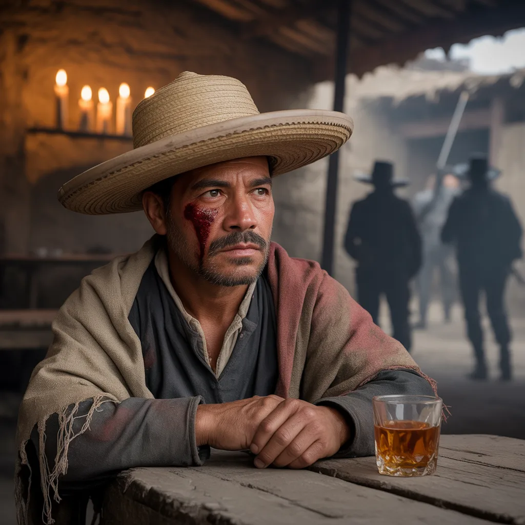 La cantina olía a sudor viejo, a pulque derramado sobre tablas sin barniz y a tortillas quemadas en un comal olvidado. Las velas de cebo chorreaban sobre latas oxidadas, proyectando sombras temblorosas contra las paredes de adobe agrietado. Villa se había acomodado en el rincón más oscuro, junto a la pared donde el yeso se desprendía en escamas como piel de serpiente muerta. Llevaba el sombrero tan calado sobre los ojos que apenas se le veía el rostro curtido por el sol del desierto y las cabalgatas interminables.