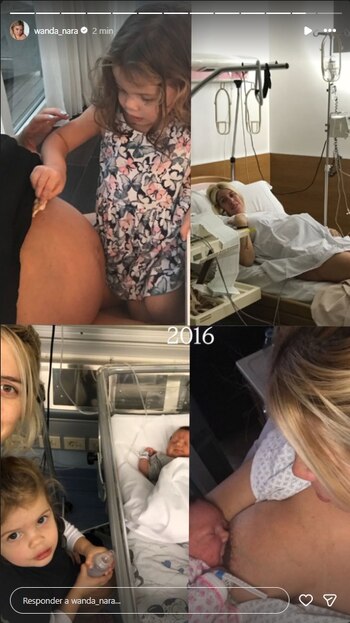 En uno de los collages, Wanda compartió cuatro momentos de su embarazo: Francesca, muy pequeña, dibujando sobre su panza; Wanda recostada en una cama de clínica, lista para dar a luz; el reencuentro en la habitación con Francesca y la recién nacida Isabella en la cuna; y una imagen íntima amamantando a la beba, reflejando el costado más maternal y cotidiano de la empresaria en ese entonces.