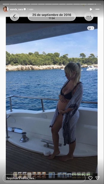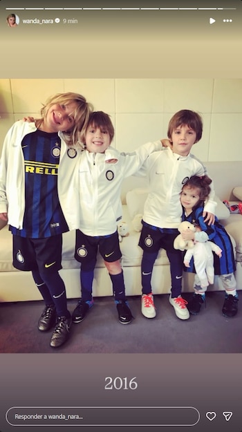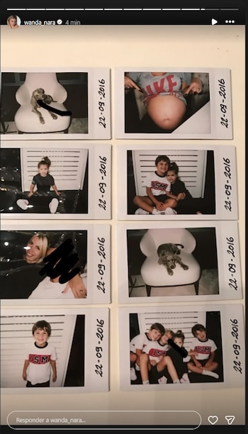 Un collage tipo Polaroid fechado en 2016 suma aún más nostalgia: aparece una imagen de Icardi con el rostro tachado con marcador negro, seguida de una foto de Wanda embarazada y varias instantáneas de Francesca, Isabella y los hermanos jugando, posando e incluso de la mascota de la familia. La postal transmite la mezcla de juego, rutina y vida doméstica de aquel entonces. Esta foto decidió borrarla y a los pocos minutos la volvió a subir, pero con el delantero del Galatasaray tapado con el ala de un ángel