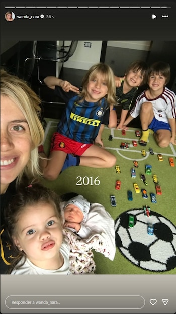 La complicidad entre hermanos queda reflejada en imágenes de los chicos abrazados, riendo y en pijama en el living, bajo la leyenda “2016 Chiquititos míos”. Wanda evocó también su cumpleaños de ese año: sentada a la cabecera de la mesa, rodeada de sus cinco hijos y una torta con velas, con Isabella en brazos y Francesca en una sillita alta. Otra selfie la muestra acostada en una alfombra verde con forma de pelota de fútbol, junto a los niños y autitos de juguete, una imagen que captura el bullicio y el juego en casa.