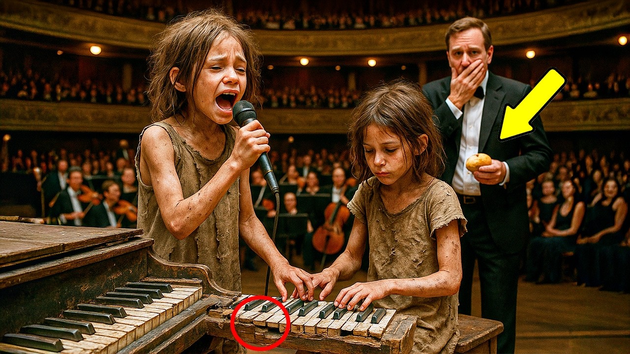 Lía reunió su voz herida: “Solo queremos cantar. Cantamos bien y mi hermana toca el piano. Si cantamos… ¿nos daría un poco de comida? Aunque sea pan de ayer”. Vittorio primero se sorprendió, luego rió cruel: “¿Quieren cantar aquí? Muy bien. Canten. Después haremos un banquete”. Su sonrisa afilada escondía la intención de humillar. Las niñas no percibieron el veneno; solo escucharon dos palabras que significaban sobrevivir: cantar, banquete.
