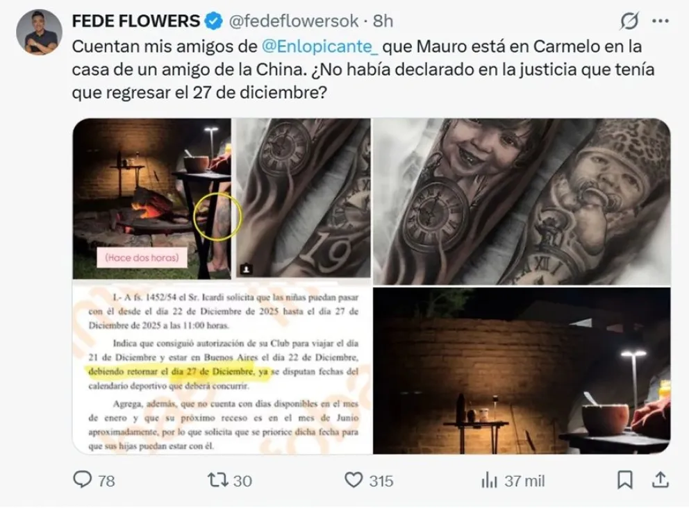 Las fotos lo muestran en Carmelo, Uruguay, en la casa de Tomás Garrahan, amigo cercano de la China Suárez. La información fue difundida por el periodista Fede Flowers, quien escribió en su cuenta de Twitter: “Cuentan mis amigos de @Enlopicante_ que Mauro está en Carmelo en la casa de un amigo de la China. ¿No había declarado en la Justicia que tenía que regresar el 27 de diciembre?”. Las imágenes adjuntas no dejan lugar a dudas: se lo ve participando de un fogón, identificado por los tatuajes dedicados a sus hijas. Informa Voces Críticas.