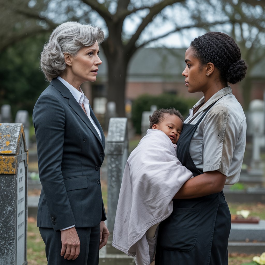 Bu yüzden, ölüm yıl dönümünde mezarına geri döndü — tek başına. Muhabirler yoktu. Asistanlar yoktu. Sadece sessizlik ve pişmanlık vardı. Ancak Hawthorne Aile Mezarlığı’nın mermer mezar taşları arasında yürürken, bir şey onu olduğu yerde durdurdu. Orada, William’ın mezarı başında diz çökmüş, soluk mavi bir garson üniforması giyen genç, siyahi bir kadın vardı. Önlüğü kırışıktı. Omuzları titriyordu. Kollarında, yumuşak beyaz bir battaniyeye sarılmış, belki de sadece birkaç aylık bir bebek vardı. Margaret’in göğsü sıkıştı.