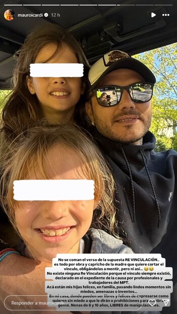 En una foto padre e hijas, sacada por la actriz, quien se ve en el reflejo de los anteojos del delantero del Galatasaray, escribió: “No se coman el verso de la supuesta RE VINCULACIÓN (sic). Es todo por obra y capricho de la madre que quiere cortar el vínculo, obligándolas a mentir, pero ni así… No existe ninguna revinculación porque el vínculo siempre existió, declarado en el expediente de la causa por profesionales y trabajadores del Ministerio Público Tutelar”.