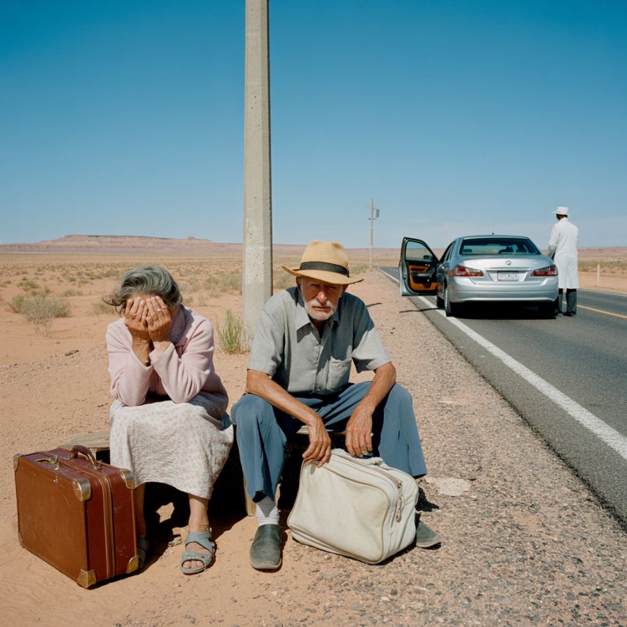conducía por la carretera vieja que conecta la capital con los pueblos del interior. Cuando algo me hizo aminorar la marcha, a unos metros del puente había dos figuras sentadas junto a un poste de luz, una mujer mayor con un vestido floreado descolorido, y a su lado un hombre de edad avanzada con sombrero de paja, ambos rodeados de bolsas de tela raídas y una maleta pequeña que parecía haber visto mejores tiempos.