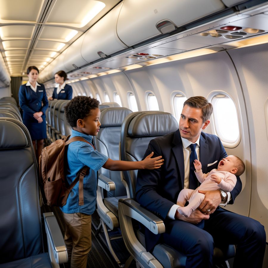 La cabina quedó en silencio. Todas las miradas estaban puestas en el niño que acunaba al bebé del multimillonario como si fuera suyo.