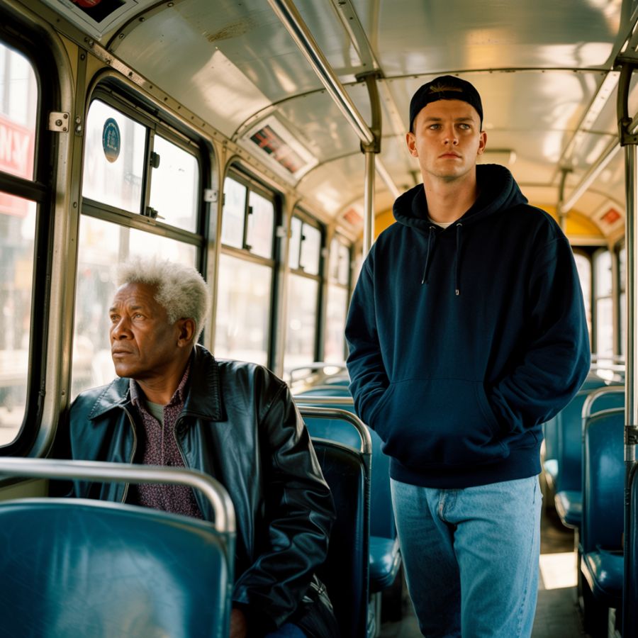 El autobús frenó en un semáforo, silenciando todo por un momento. El hombre finalmente habló, con voz baja pero firme:
