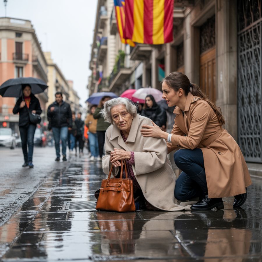 —¡Dios mío, señora! —susurré, agachándome con cuidado sobre la acera mojada, sintiendo cómo el agua fría atravesaba la tela de mis pantalones.