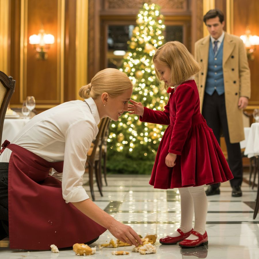 Una camarera se arrodilló junto a la mesa con una suavidad que parecía imposible en un lugar tan lleno de ojos. Llevaba el uniforme impecable, pero su gesto no era el de alguien que busca quedar bien: era el de alguien que entiende el miedo porque lo ha conocido de cerca. Sus ojos color avellana tenían una calma que no se actuaba. Posó la bandeja a un lado, despacio, como si hasta los objetos necesitaran respeto.