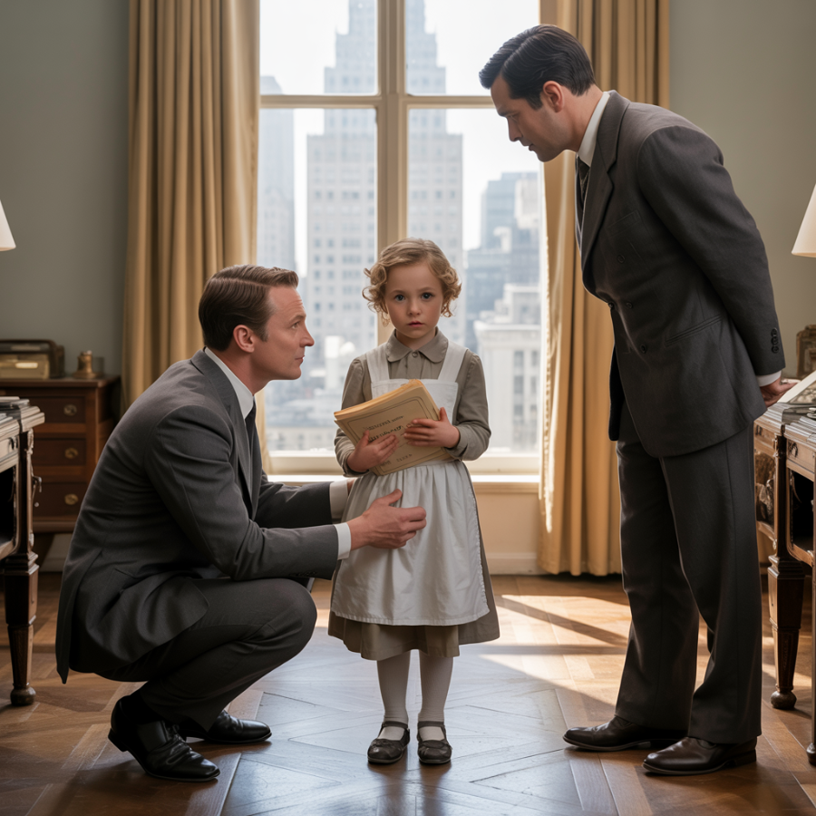 En la mano sujetaba una sola hoja de papel arrugado, con la solemnidad de quien trae un documento oficial. Sus ojos oscuros estaban abiertos de par en par, cargados de un miedo puro, pero ella lo escondía detrás de un gesto serio, casi desafiante.