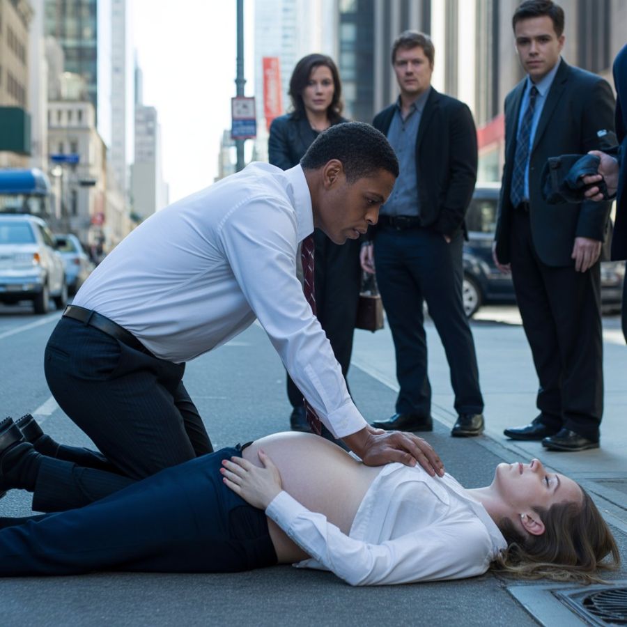 Mientras caminaba por Elm Street, un grito repentino cortó el aire matutino. “¡Socorro! ¡Por favor, que alguien me ayude!”. La voz sonaba de pánico, desesperada. Marcus se giró hacia el lugar de donde provenía. Una mujer, visiblemente embarazada y a punto de dar a luz, yacía en la acera, agarrándose el vientre. Su rostro se contorsionaba de dolor.