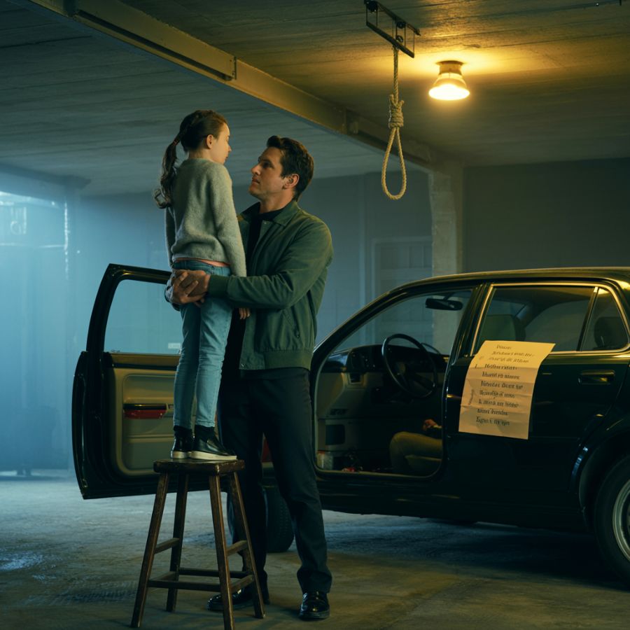 Mi vuelo fue cancelado, así que conduje a casa. Mi hija no estaba en su habitación. Mi esposa dijo que estaba en casa de la abuela. No llamé. Llegué y todo estaba silencioso. Caminé al patio trasero y vi una luz en el garaje. Abrí la puerta y la encontré: mi hija, de pie sobre un taburete, atada al techo. “Tengo que quedarme así hasta la mañana,” susurró. Eran las 2 AM. La liberé, y colapsó. Susurró: “Papá, revisa el carro del abuelo.” Lo que encontré allí… cambió todo lo que creía sobre nuestra familia.