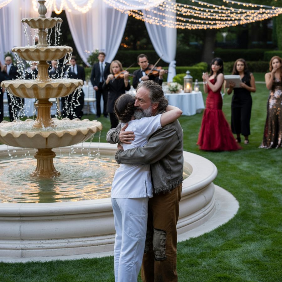 Cuando los invitados comenzaron a aglomerarse en el jardín, la música se detuvo por un segundo extraño. No porque alguien diera una orden, sino porque la escena en la reja principal parecía un error del universo: un hombre mayor, con la barba crecida y desordenada, ropa rasgada, un pantalón manchado y una manta raída sobre los hombros, caminando con una dignidad que no encajaba con su aspecto.