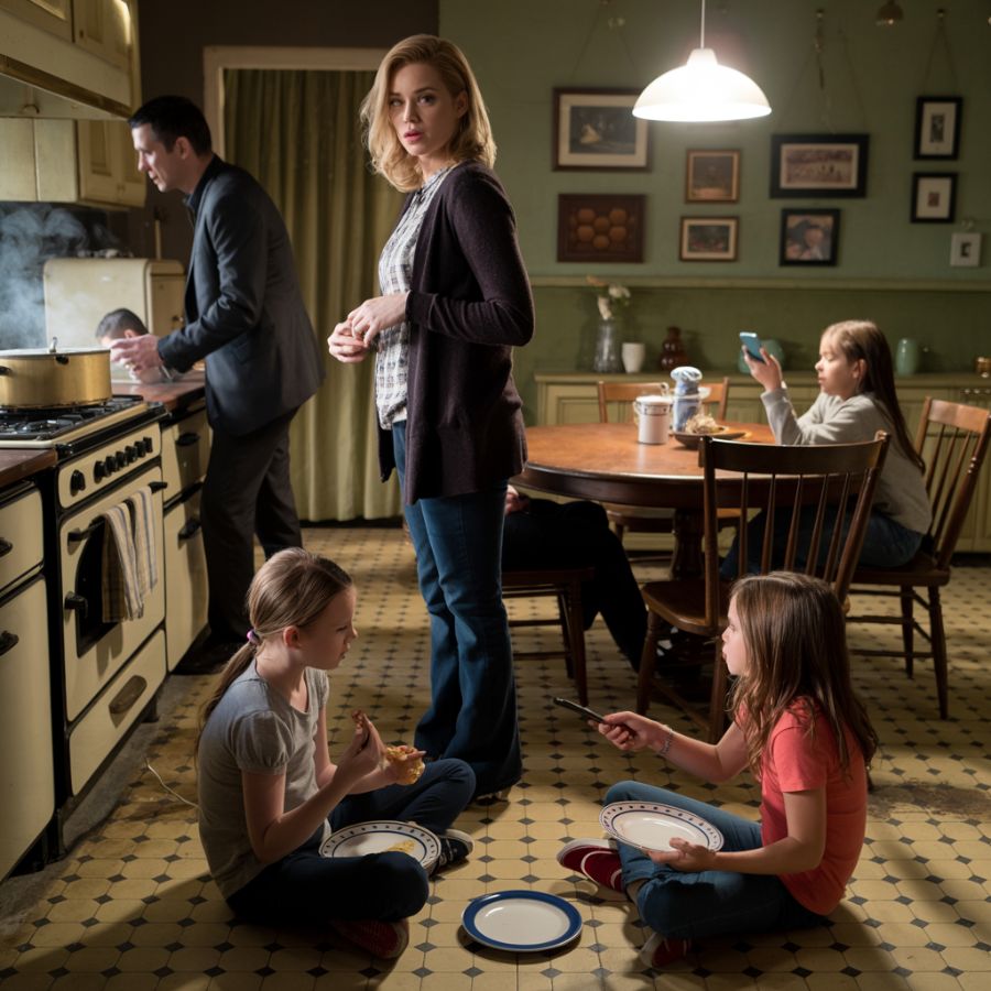 Mis hijos, Jamie y Tyler, estaban sentados en el suelo de la cocina, con las piernas cruzadas, mirando tristemente sus sándwiches secos de mantequilla de maní. Mientras tanto, los hijos de mi hermana Jessica ocupaban la mesa, con platos de espagueti humeante y vasos de leche que brillaban bajo la luz del comedor.