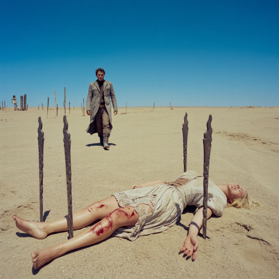 El hombre desmontó con un movimiento pesado, sin florituras. Su bota hundió el polvo con un crujido seco. Caminó hacia la joven extendida en la arena con una calma que resultaba inquietante, como si ni el sol ni la мυerte lo apresuraran. Era un hombre maduro. Su espalda recta hablaba de disciplina, pero su andar tenía el peso cansado de quien ha caminado demasiado.