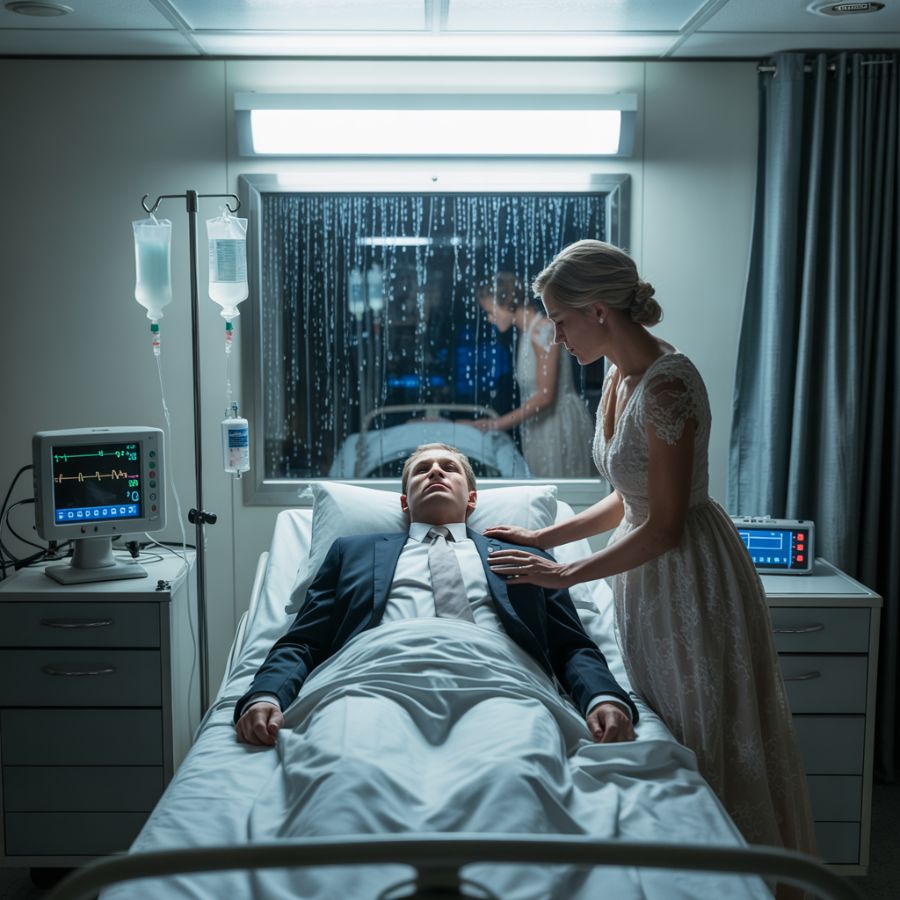 Al día siguiente, bajo vidrieras y velas parpadeantes, se quedó de pie con tacones prestados mientras las enfermeras llevaban a Daniel al interior. El sacerdote leyó los votos con cansada reverencia, y Clara forzó la salida de las palabras: