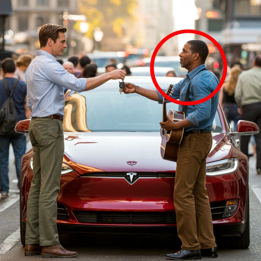 Si tocas esa canción, te regalo mi coche”, gritó Tyler Blackston señalando el Tesla Model Samplad Rojo aparcado a pocos metros mientras se burlaba del hombre negro sentado en la cera de Borbon Street en Nueva Orleans. El coche valía más de $130,000. El mendigo ni pestañeó. William Carter, de 45 años, había visto muchas cosas durante sus tres años viviendo en las calles de Nueva Orleans, pero nunca imaginó que un jueves cualquiera se convertiría en el día que lo cambiaría todo.