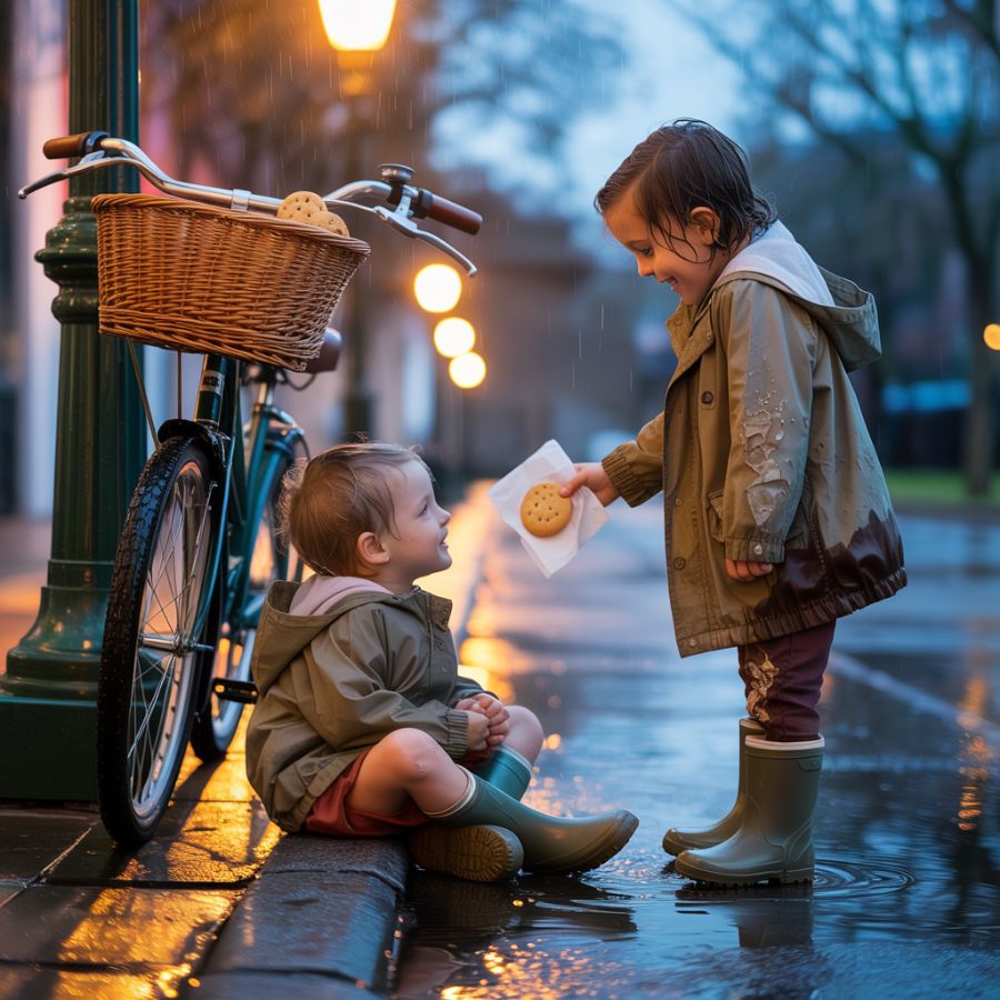 Ella lo ayudó a subir a su bicicleta y caminó junto a ella bajo la lluvia hasta llegar al Centro Comunitario de Fifth Street , donde los voluntarios repartían sopa y mantas. Le dio una de sus galletas. Él la comió despacio, como si fuera un tesoro.