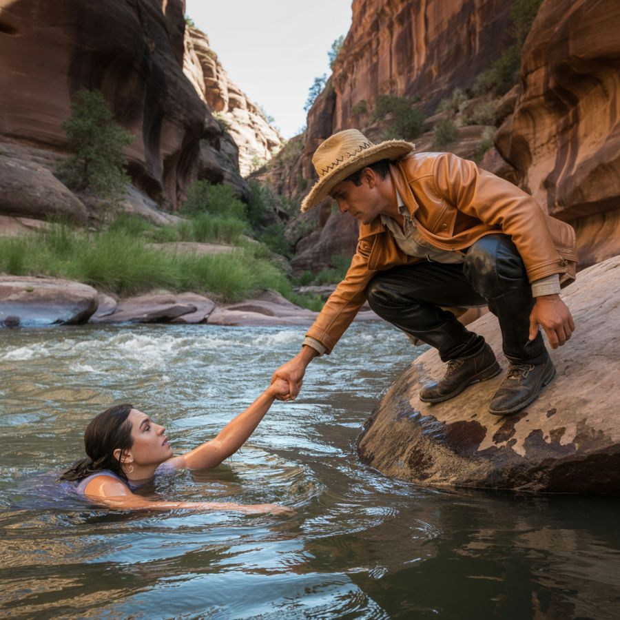 Sin pensarlo dos veces, Cael se lanzó al agua helada. La corriente lo tocaba como puños invisibles, pero sus músculos endurecidos por años de supervivencia lo impulsaron hacia adelante. La joven ya no gritaba; su cabeza se hundía y emergía mientras sus fuerzas se desvanecían. Cuando Cael logró alcanzarla, sus ojos azules como el cielo de verano lo miraron con una mezcla de terror y súplica que le atravesó el alma. La sacó del agua con la fuerza desesperada de quien rescata su propia salvación.