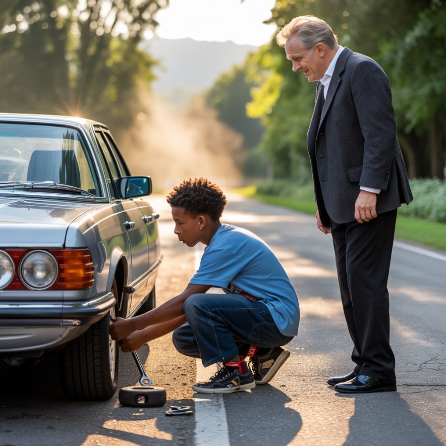 Matthew se quedó atónito, con el dinero aún en la mano, mirando cómo el muchacho se alejaba por el camino. Algo en ese gesto lo conmovió profundamente, aunque no supo explicarlo. Guardó el dinero, subió al auto y miró por el retrovisor cómo la figura del chico se hacía más pequeña.