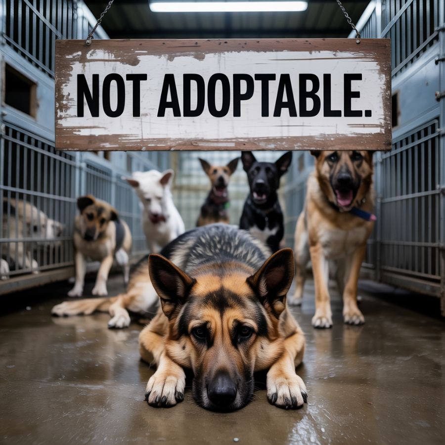 Pero en la parte trasera, en la jaula más silenciosa, estaba un pastor alemán al que nadie se detenía a mirar. No ladraba, no se movía. Estaba sentado con la cabeza gacha, las orejas caídas, mirando al suelo como si no supiera que aún estaba vivo. Su placa de identificación había caído hacía mucho. Lo único que colgaba en su jaula era un letrero de madera astillado con una palabra no adoptable.