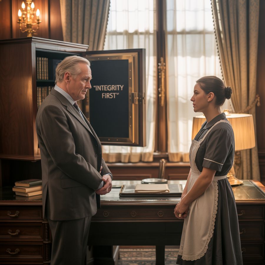 Veinte minutos después, María regresó con un rollo de cinta adhesiva y un paño de limpieza. Reparó el marco lo mejor que pudo, limpió el cristal y colocó la foto en posición vertical sobre el escritorio de David. Luego, con determinación, cerró con cuidado la puerta de la caja fuerte y reanudó la limpieza.
