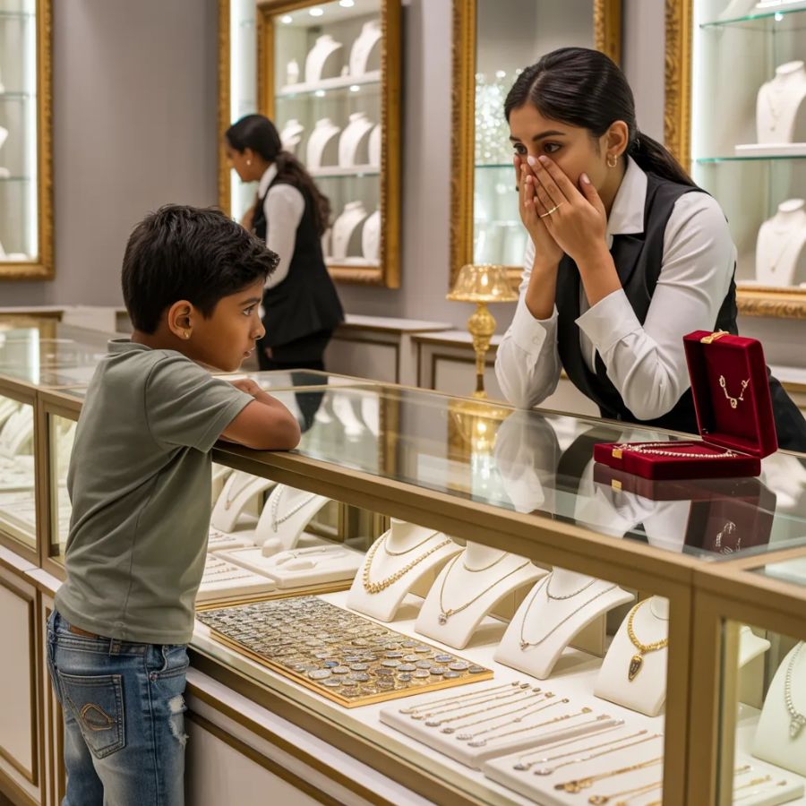 Un niño harapiento entró silenciosamente en la lujosa joyería y derramó miles de monedas frías sobre el vidrio reluciente. El guardia de seguridad estaba a punto de expulsarlo, pensando que la pobreza que cubría su cuerpo era una mancha frente a los clientes adinerados. Pero en ese instante, la gerente se detuvo… porque las palabras que el niño acababa de pronunciar dejaron a toda la sala en silencio.