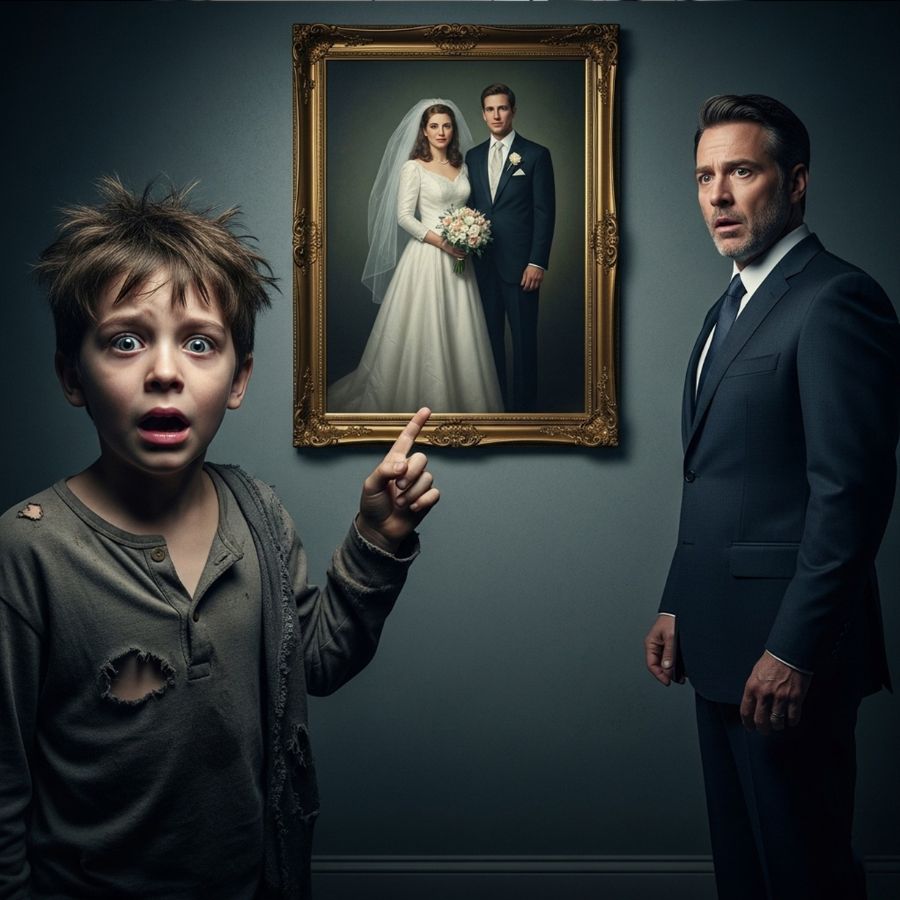 Una mañana lluviosa de jueves, James iba en coche a una reunión de la junta directiva cuando el tráfico se ralentizó cerca de la panadería. Miró por la ventana tintada y vio a un niño, de no más de diez años, descalzo en la acera, empapado por la llovizna. El niño miraba fijamente la foto de la boda en el escaparate de la panadería. James lo miró sin pensarlo mucho… hasta que el niño señaló directamente la foto y le dijo al vendedor que estaba a su lado:
