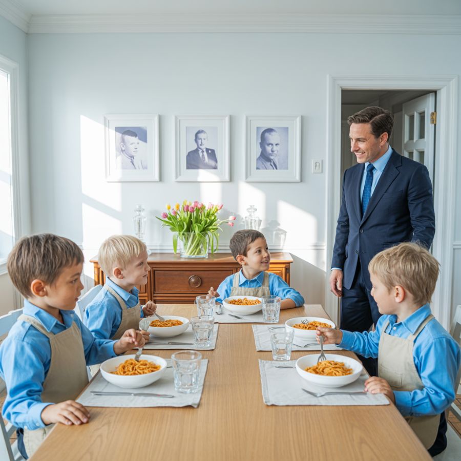 A la mañana siguiente, Richard hizo panqueques, los quemó un poco, pero lo intentó. Llamó a los chicos a la cocina. Los cuatro se sentaron, curiosos.