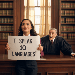 Hizo una pausa dramática caminando lentamente frente al jurado. cobró miles de dólares por traducciones que supuestamente realizó en 10 idiomas diferentes. 10 su señoría. Pero la realidad es que esta joven apenas terminó la educación secundaria y no tiene ninguna certificación, ningún título, ninguna credencial que avale su supuesta capacidad lingüística.