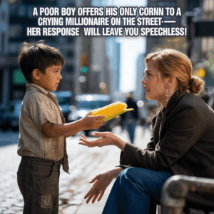 PEQUEÑO MENDIGO OFRECE SU ÚNICO MAÍZ A UNA MILLONARIA QUE LLORABA EN LA ACERA, Y LO QUE ELLA DIJO…
