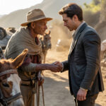 Alto, demacrado, polvoriento por el viaje, abrigo oscuro a pesar del calor, ojos que calculaban todo lo que veían. ¿Puedo ayudarte? llamó James desde el porche. “Me llamo Calhun”, dijo el hombre viajando. “Podría usar algo de agua para mi caballo.” Moses trajo agua, observando al extraño con cuidado.